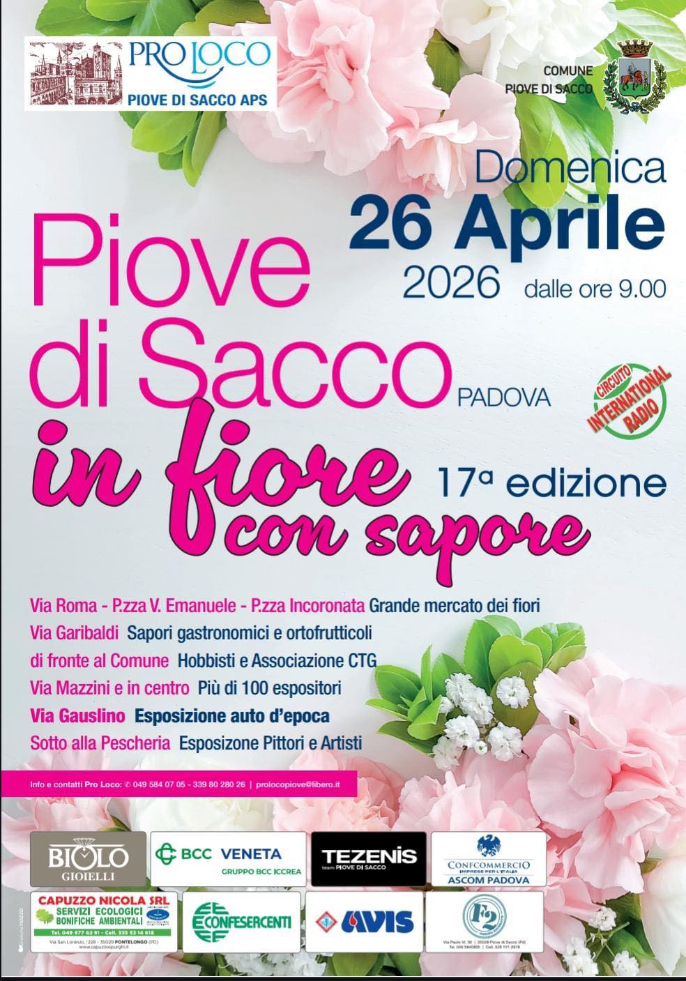 La manifestazione "Piove in Fiore con Sapore" avrà inizio alle ore 9.00 e durerà tutta la giornata. Tutto il centro storico di Piove di Sacco ospiterà una grande esposizione di fiori, piante, prodotti gastronomici, bancarelle, mostre d'auto d'epoca e d'arte, giochi gonfiabili e divertimenti per bimbi e famiglie.